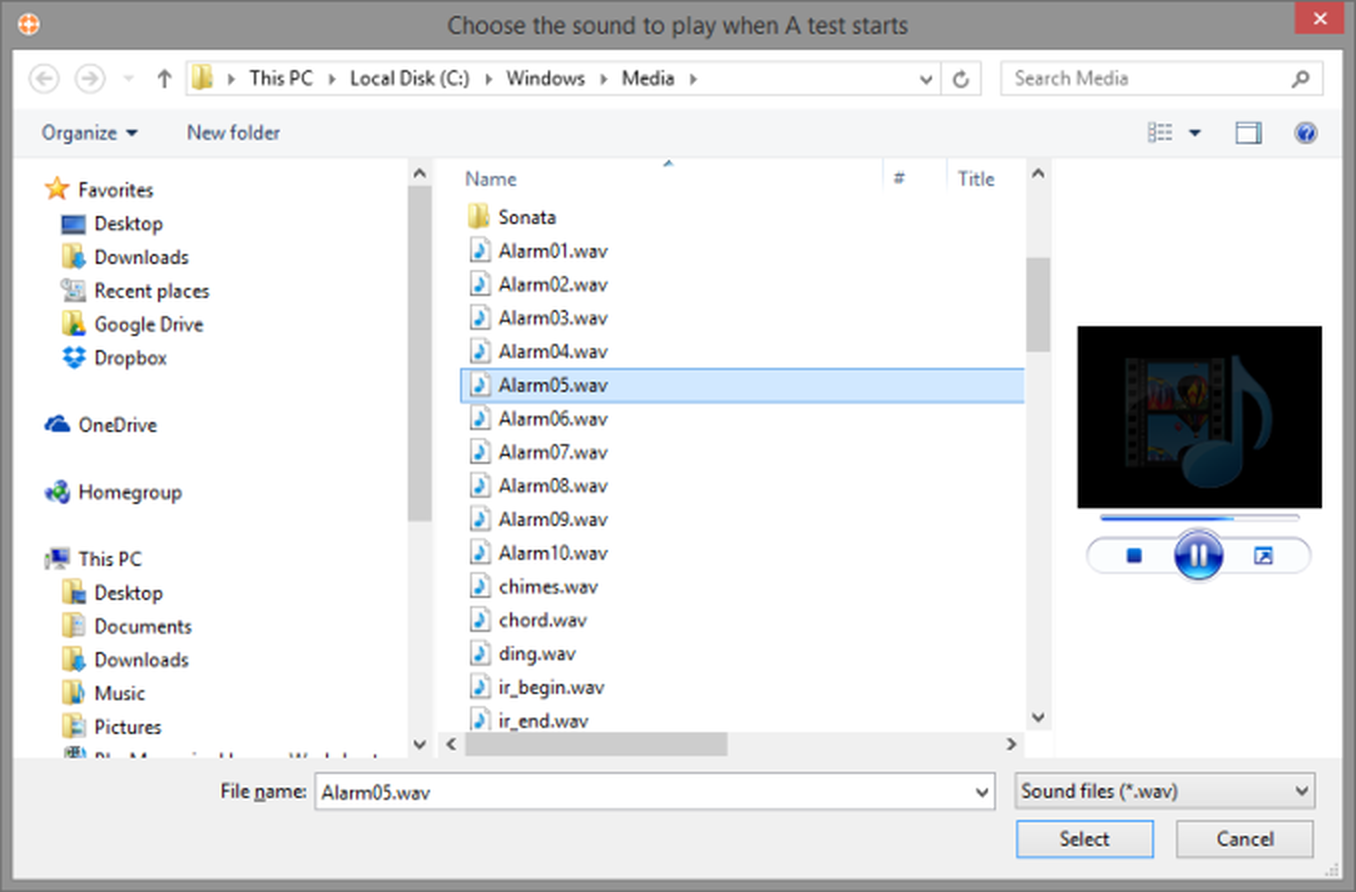 ANY-maze Help > The ANY-maze reference > The Options page > Changing ANY-maze sounds > Choosing a sound file Choosing a sound file