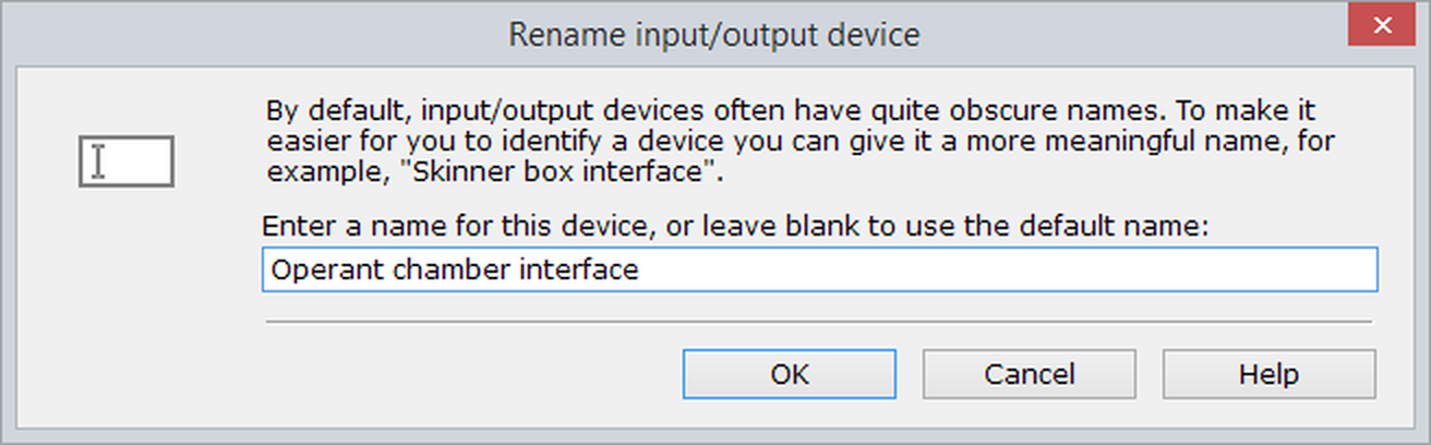 ANY-maze Help > The ANY-maze reference > The I/O page > Working with the I/O page > Renaming an input/output device Renaming an input/output device