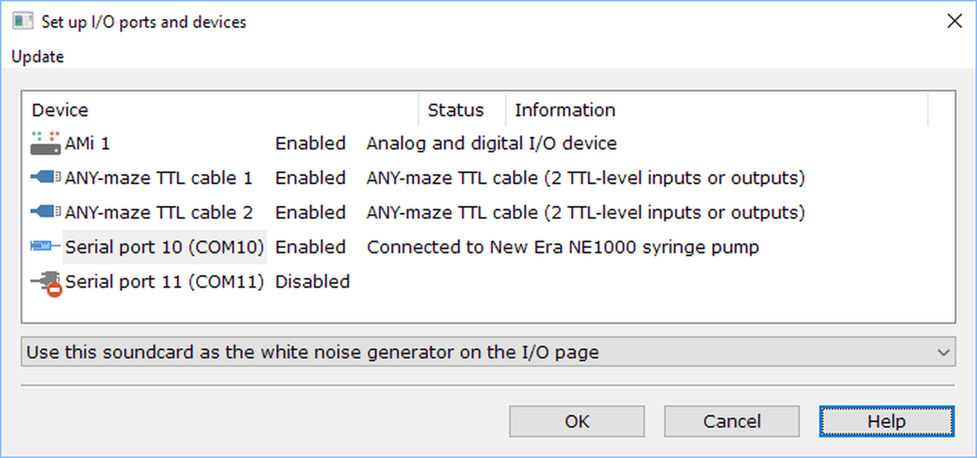 ANY-maze Help > The ANY-maze reference > The I/O page > Working with the I/O page > Setting up the I/O devices to use with ANY-maze Setting up the I/O devices to use with ANY-maze