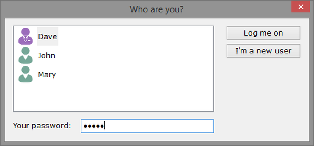 | Log me on | Once you've selected your name in the list, and entered your password (if required), then clicking the Log me on button will give you access to ANY-maze. |
