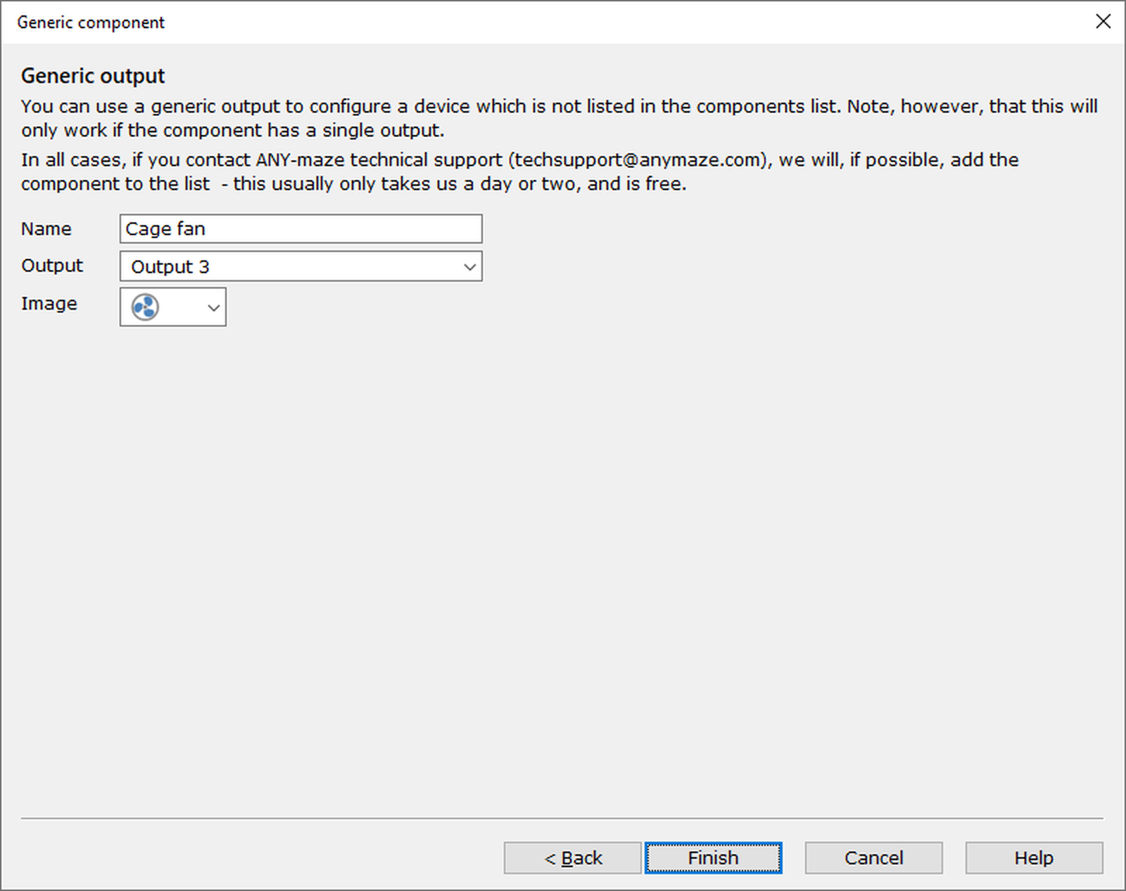 Figure 1. The 'Generic output' page of the ANY-maze Operant interface 'Add/Edit component' wizard. In this case, the output has been set up for a cage fan.