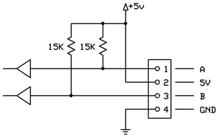 Figure 1. Conceptual internal circuit of an ANY-maze Digital interface rotary encoder port. (The port pins are numbered left to right, looking into the port).