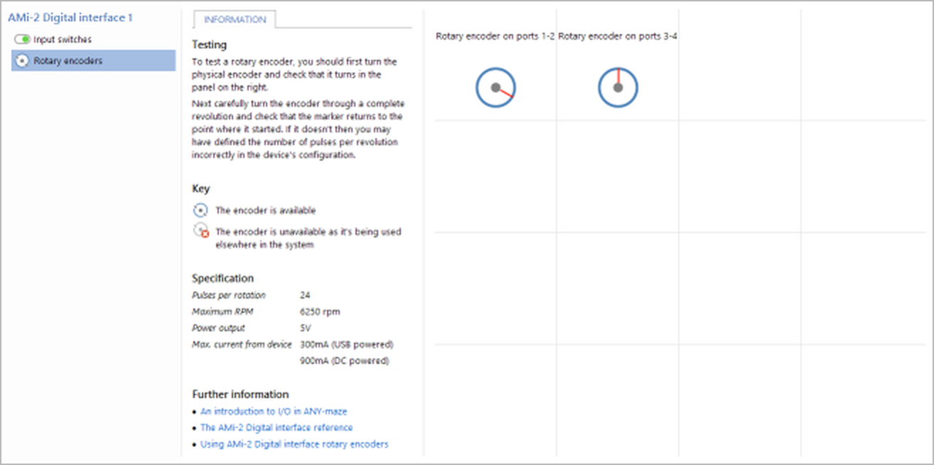 Something else you may wish to know is the maximum number of rotations per minute (RPM) that the encoder will support. This depends on the pulses per rotation (PPR) of the encoder, but ANY-maze will show it under Information > Specification on the I/O page when a rotary encoder port is selected. See also:
