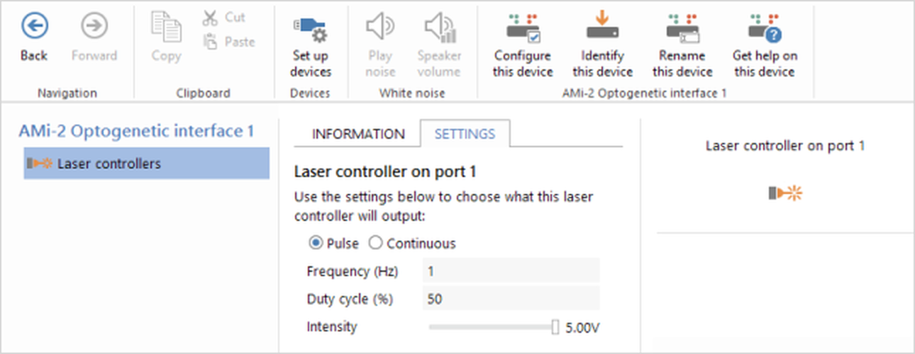 If your laser supports adjustments to its intensity, then you can slide the intensity slider down and you should see the laser's intensity reduce. If your laser doesn't support this function, then as you reduce the intensity nothing will happen until a point where the laser will simply switch off (stop flashing). Of course, you can also try other tests, such as altering the frequency and/or duty cycle, until you're satisfied that the laser and optogenetic interface are functioning correctly. You'll then be ready to use the laser in some tests. See also: