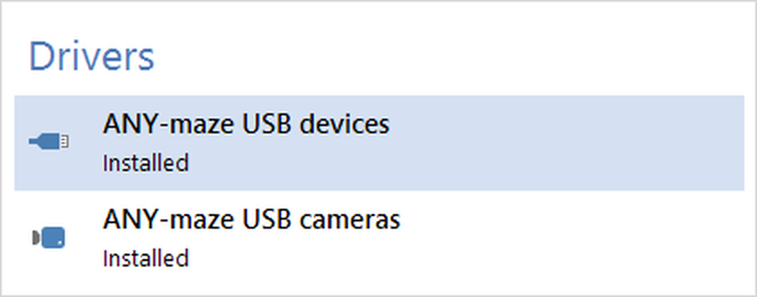 | | 2. | If it still doesn't appear, then follow the instructions above to check that the 'ANY-maze USB devices' driver is installed. If the driver is not installed, then unplug the tank, install the driver and then plug the tank back in again. | |