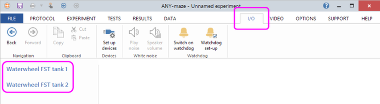| | • | On the left side of the I/O page is a list of input/output devices, and you should see one entry for each Waterwheel Forced Swim Test tank you have connected to your computer - see figure 2, below. | |