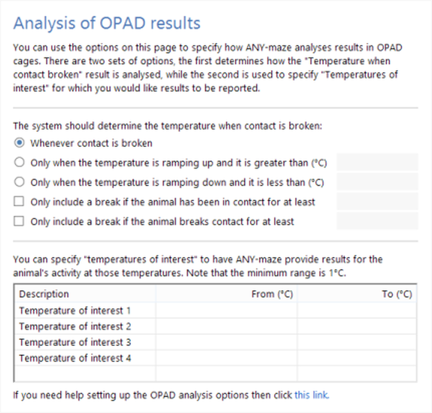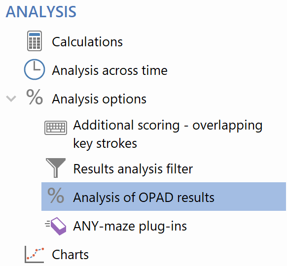A complete list can be found here. If the OPAD used for the test includes a weight sensor, then for 'drink consumption' ANY-maze reports the change in weight - that's to say the amount of liquid the animal consumed during the test. The more interesting results are those that are specific to OPAD, which include Temperature when contact broken and various results for Temperatures of interest. These special results are in fact configurable using options specified in the protocol. To access these options, you need to navigate in the protocol list to Analysis > Analysis of OPAD results, as shown in figure 1.