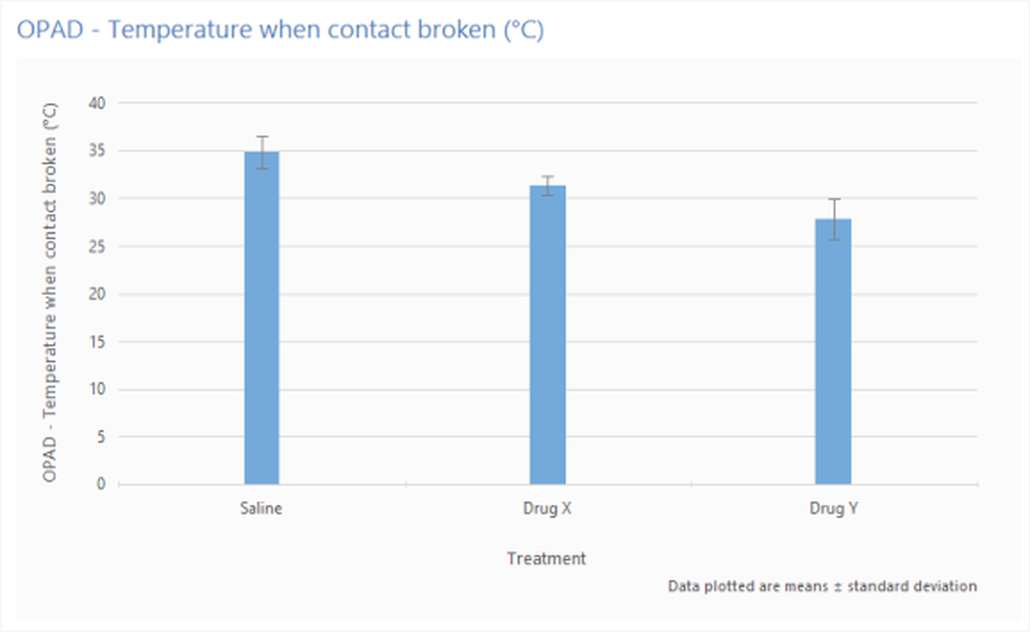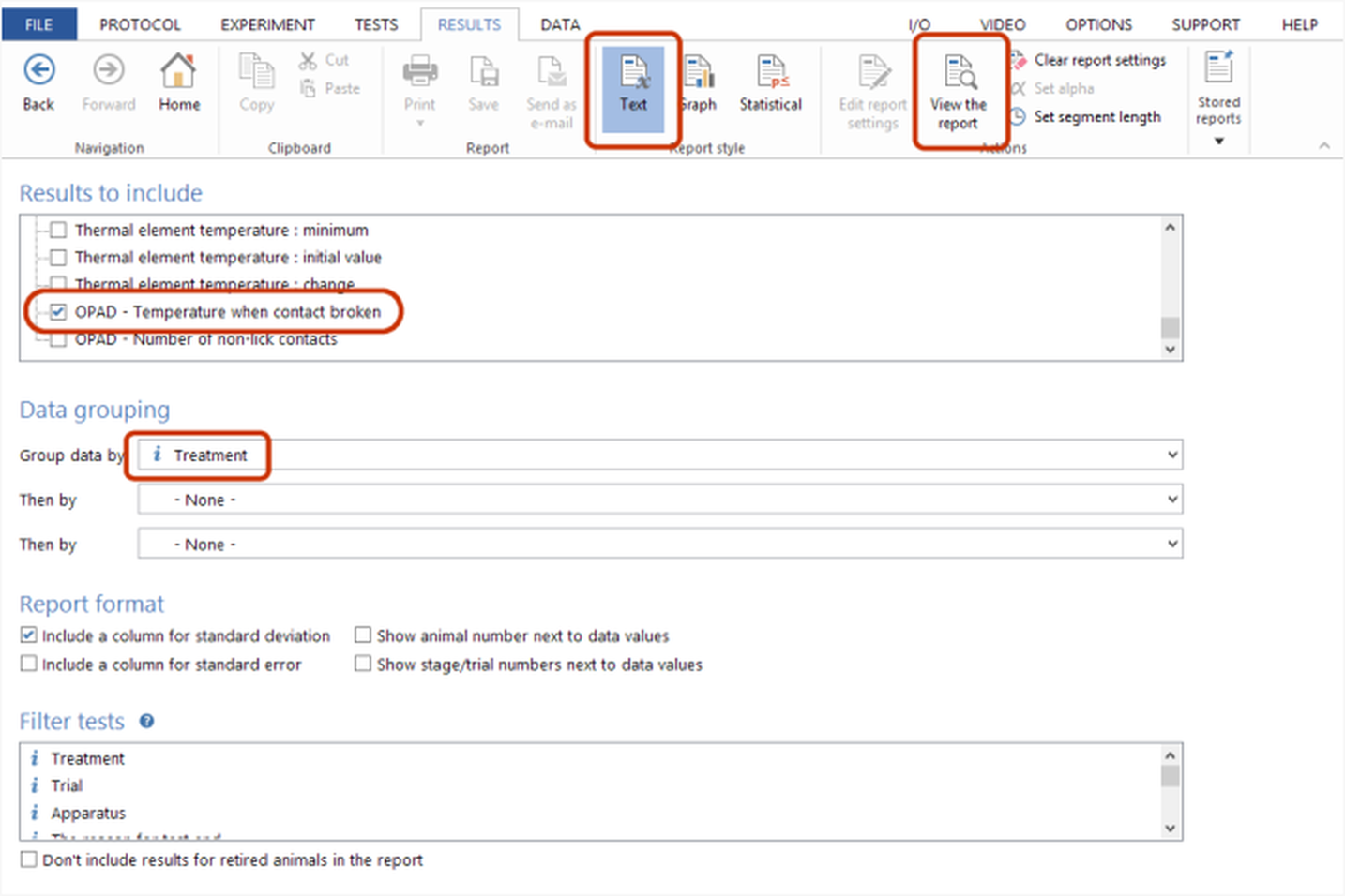 OPAD cage analysis options can be changed at any timeA very important thing to understand about these options is that you can change them at any time, including AFTER tests have been performed. For example, imagine you performed an experiment consisting of 100 tests. After the experiment you realise that it would have been useful to look at the animals' behaviour when the thermal elements were around 40°C. You DON'T need to perform all 100 tests again; instead you can just switch to the protocol, add a temperature of interest for the range 38-42°C (or whatever) and the results will immediately be available. The same thing applies to the settings for Temperature when contact broken. Viewing collated resultsEarlier in this tutorial we saw how we could view results for individual tests, but you will typically want to look at results that are collated into groups - for example, treatment groups or perhaps stages of the experiment. This is what the ANY-maze Results page is for. To switch to the Results page, just click the Results tab above the ribbon bar. Let's imagine we want to compare the Temperature when contact broken between our different treatment groups - to do this, we would make the selections shown in figure 3.
