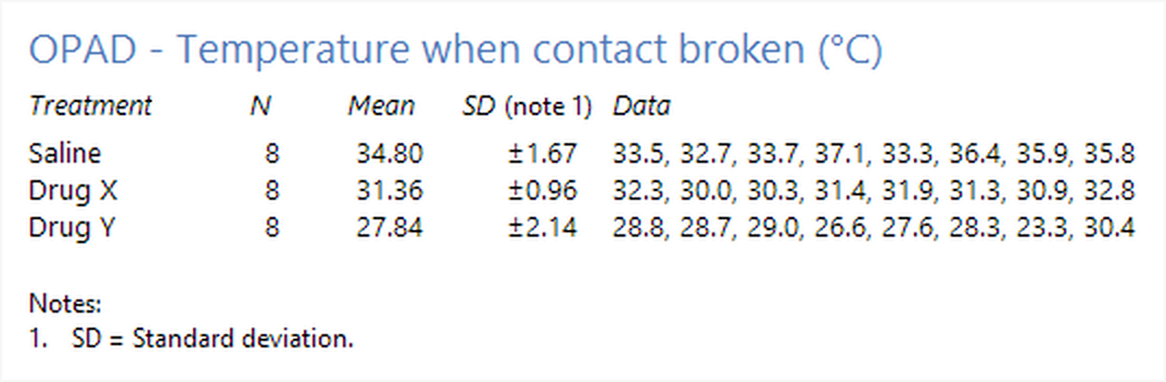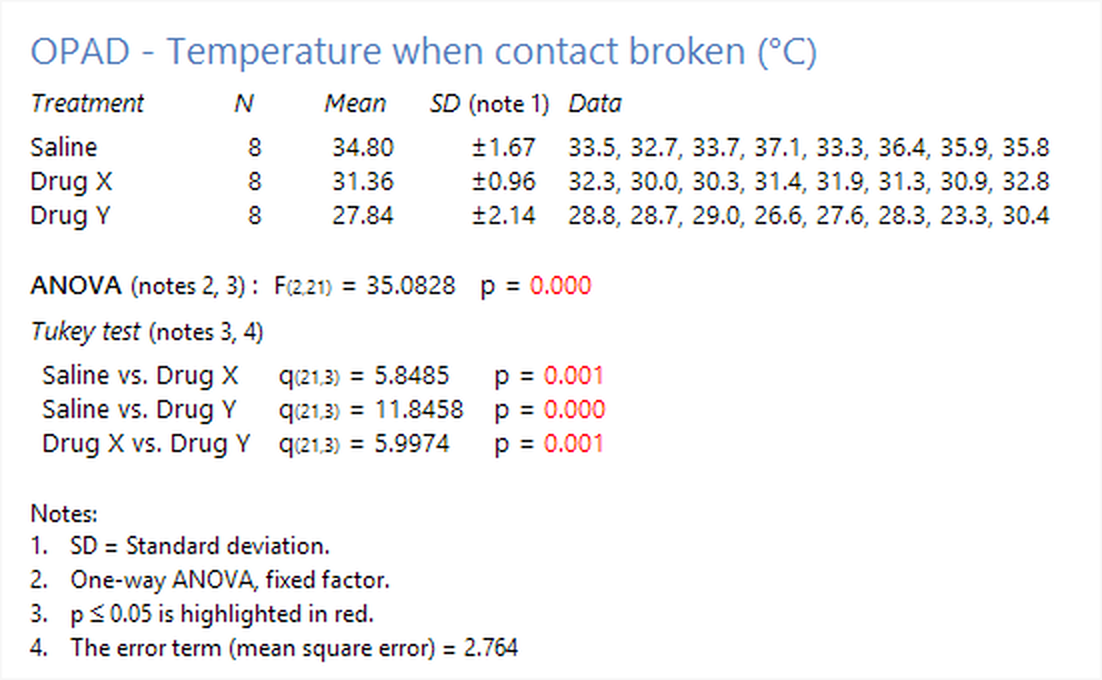 Performing statistical analysis of resultsIn the previous section we looked at the Text and Graph report styles, but there's another style called Statistical. As the name implies, this will perform statistical analysis of your data - figure 6 shows the same data as figure 4 and 5, but analysed using a 1-way ANOVA followed by Tukey's post-hoc test.