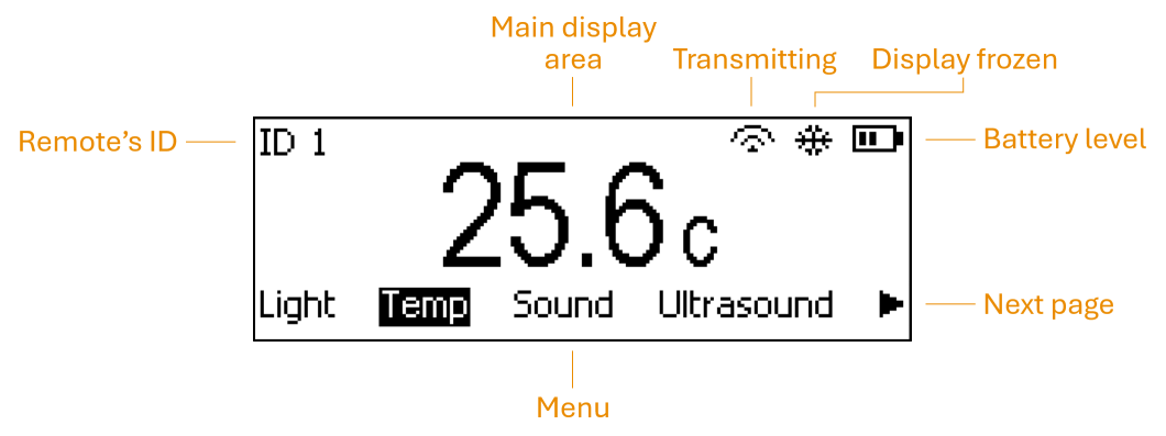 Navigating the menuPressing the Next button moves through the menu items. There are more menu items than will fit across the bottom of the display. On the far right of the menu is an arrow icon; selecting it and pressing the Enter button will take you to the next page of menu items. The next page will have a left arrow icon at the far left; selecting it and pressing the Enter button will return to the previous page. LightDisplays the current light level. For more information see Using the multifunction remote to measure light levels. TempDisplays the current temperature. For more information see Using the multifunction remote to measure temperature. SoundDisplays the current sound level. For more information see Using the multifunction remote to measure sound levels. UltrasoundDisplays the current ultrasound level. For more information see Using the multifunction remote to measure ultrasound levels. IDAllows you to change the ID of this multifunction remote. The IDs you can choose from are defined in ANY-maze, but they will always be between 1 and 16 (though not all of them may be available). For example, in ANY-maze, you might choose to work with remotes with IDs 1, 2, and 4. In this case, pressing the Enter button when the ID menu item is selected will cycle through the following options: Remote ID 1 Remote ID 2 Remote ID 4