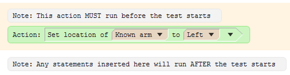 DescriptionIf you've set up a zone to be a movable zone, you can select for each stage of the test whether the location of the zone should be set by a procedure (rather than setting it to be the same for each animal, or setting it manually when each test starts). This is set up in the stage's settings page, under Location of the zone during this stage. If you've set up your stage in this way, you can use the Set location of movable zone action to specify the location of the movable zone. However, this must be done in the shaded area at the top of the procedure editor, and not in the main body of the procedure - the location of a movable zone can't be altered after the test has started. This error is displayed in the list of errors and warnings at the bottom of the procedure editor when a procedure is checked for errors, or when the procedure editor is exited. ExampleWhen using the Set location of movable zone action, it must be dragged into the shaded area at the top of the test, as shown below: