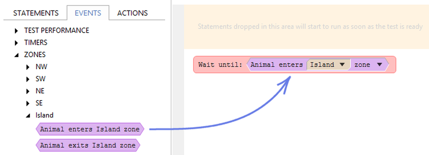Now we need to use the mouse to drag the Animal enters Island zone event, and drop it over the purple 'hole' in the Wait until statement: