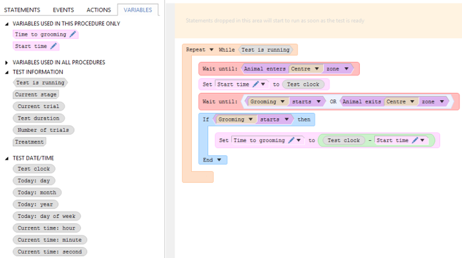 This example uses two variables - one called 'Start time', which is used to note the time at which the animal enters the zone, and the other called 'Time to grooming' which uses the previously-noted start time, together with the Test clock built-in variable to calculate the time it took to start grooming after entering the zone.