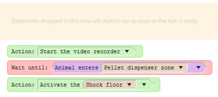 Figure 1. In the procedure above, as soon as the test starts, the procedure statements will start running. The first statement will be run (turning the video recorder on), then the second statement will wait until the animal enters the 'Pellet dispenser' zone. All subsequent events that occur within the test (animal movement, I/O inputs, etc.) will be checked against this wait statement, but ignored until the one occurs that it is waiting for (entry to the relevant zone). Only at that point will the procedure continue running, and will turn on the 'Shock floor' shocker. The procedure will then end.