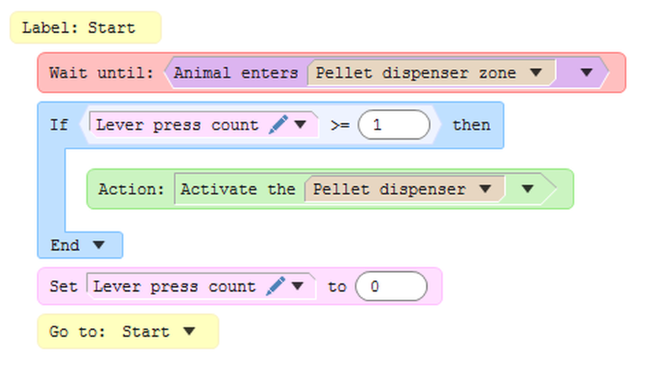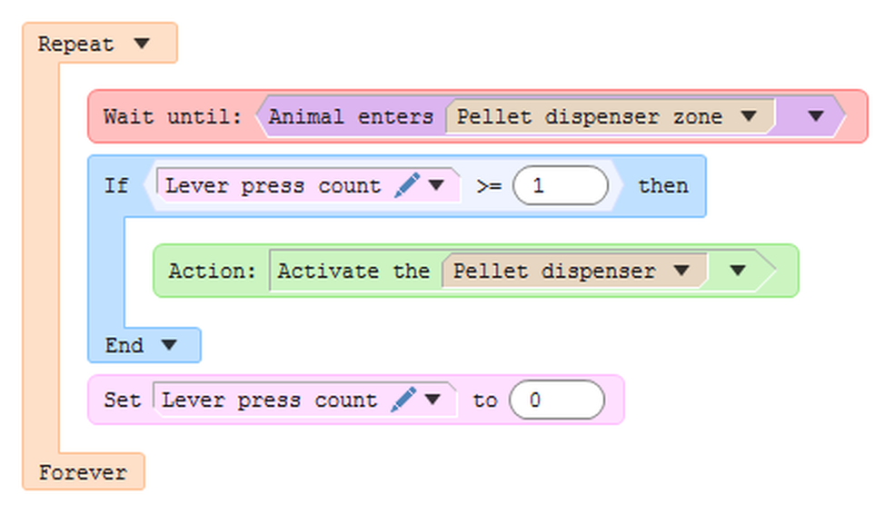 Split different logical areas into different procedures.Multiple procedures can be run at the same time, which makes it easier to perform complex logic as part of the test. It's advisable to split any complex logic into multiple procedures, as this makes it much easier to understand. For example, let's say you have a pellet dispenser, but you only want to activate this if the animal has previously pressed a lever. If the animal goes near the pellet dispenser without first activating the lever, you want to give them a shock. The logic for such an experiment can quickly get complicated, such that trying to write this all in a single procedure could get messy - so you'd be better off writing it as two much simpler procedures, where the logic for each one is self-contained, i.e.