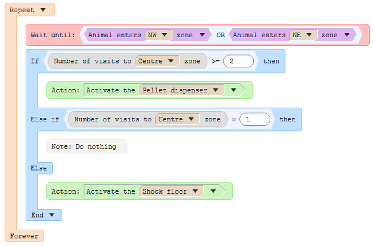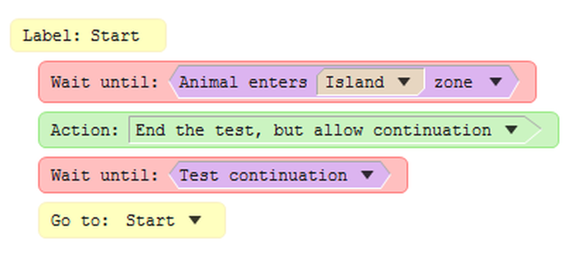 Note that the procedure in figure 3 differs from the one described in the first walk-through example, in that it also loops back to the start of the test, in case you do force continuation - otherwise the procedure will never go back to waiting for the animal to enter the island again. See also: