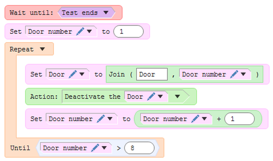 Waiting for the Test ends event.There may be circumstances under which you want to take specific action only at the end of the test. For example, you might have a radial arm maze that opens and closes doors in a particular sequence, or according to the animal's movements. When the test ends, you want to open all doors of the maze to leave it in a 'known' state. So how would you achieve this, if the procedure ends when the test ends? When the test ends, the procedure will receive a Test ends event. If that's the event that the procedure is currently waiting for, then it will process that Test ends event and run any subsequent statements. Only if it reaches another Wait until statement (or there are no more statements in the procedure) will the procedure finally stop. So the following procedure could be used to close the doors of our radial arm maze: