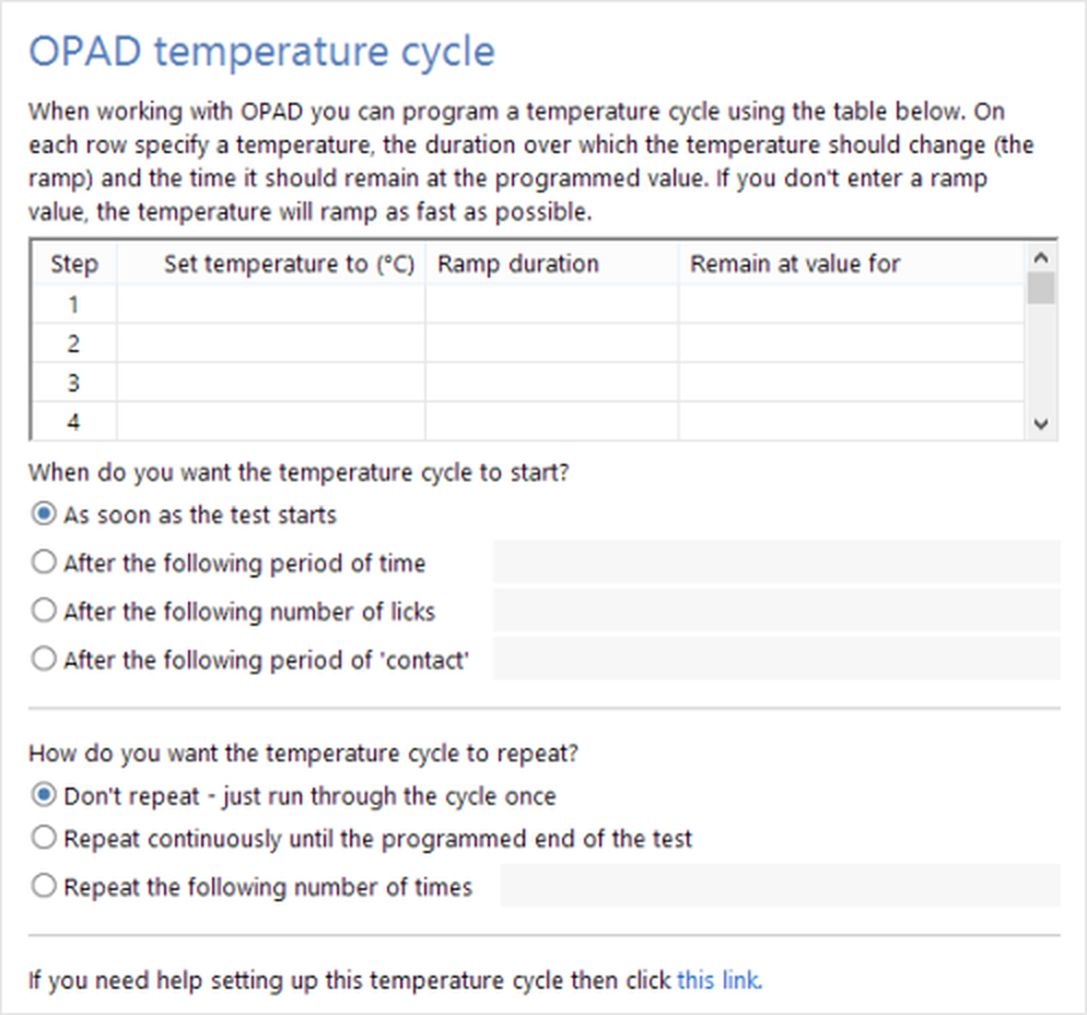 In briefWhen setting up the temperature controller in an OPAD cage, you will find that the temperature controller element in the protocol list includes a sub-element titled 'OPAD temperature cycle', which can be used to program a 'temperature cycle' - see figure 1.