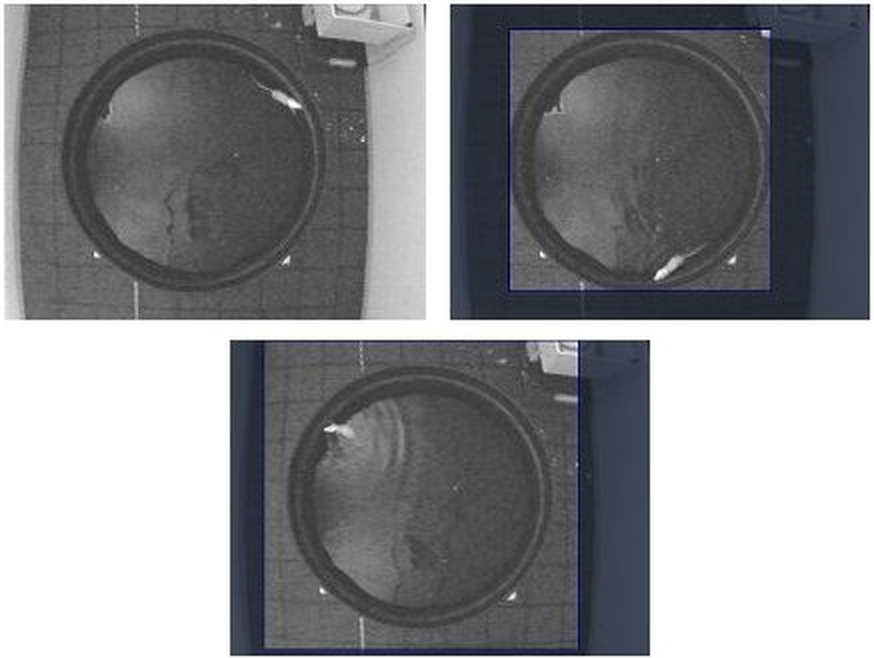 Figure 1. The first image shows the full picture from the camera. As there's a lot of the image which isn't part of the water-maze, it would be a good idea to crop the excess. In the second image, too much of the excess has been cropped, so auto-start probably won't work. In the final image, the selected area is just right.