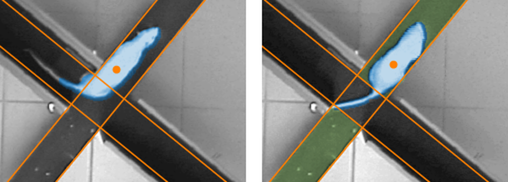 Figure 3. In the first image, the centre of the animal (indicated by the orange dot) has entered the open arm, but ANY-maze doesn't count this as an entry because less than the required amount of the animal - 85% in this case - is in the zone. The blue shading indicates the area that the system considers to be the animal. In the second image, ANY-maze does consider the animal to be in the zone, which it indicates by shading the zone in green. Here, the 85% entry value acts as a good approximation to the plusmaze 'four paws in the arm' rule.