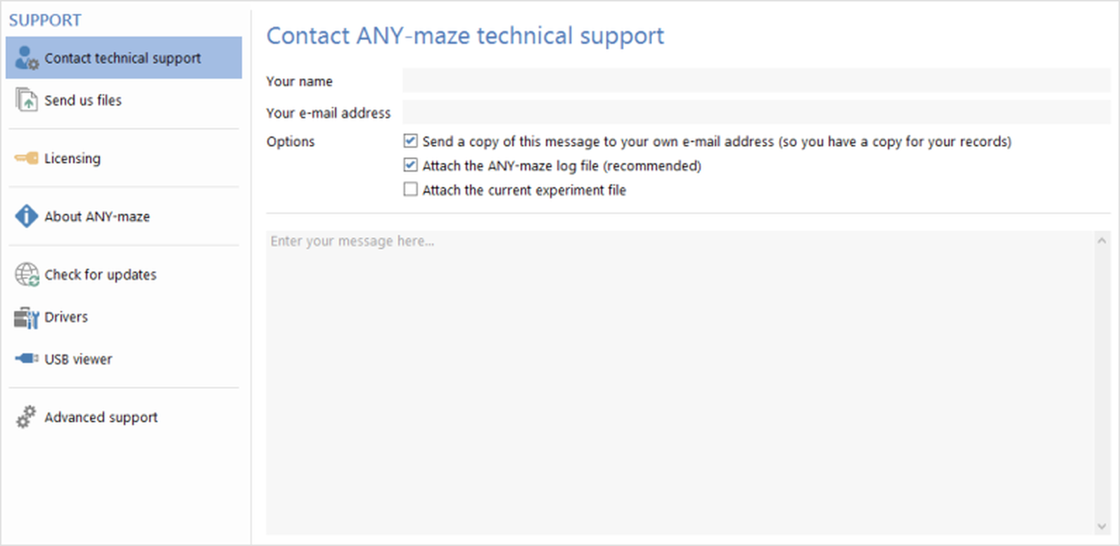 ANY-maze Help > The ANY-maze reference > The Support page The Support page
