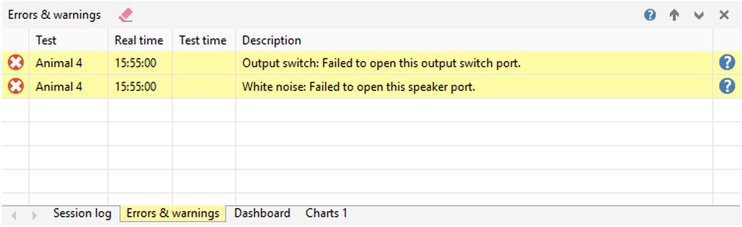 ANY-maze Help > The ANY-maze reference > The Tests page > The Test window > The Errors & Warnings panel The Errors & Warnings panel