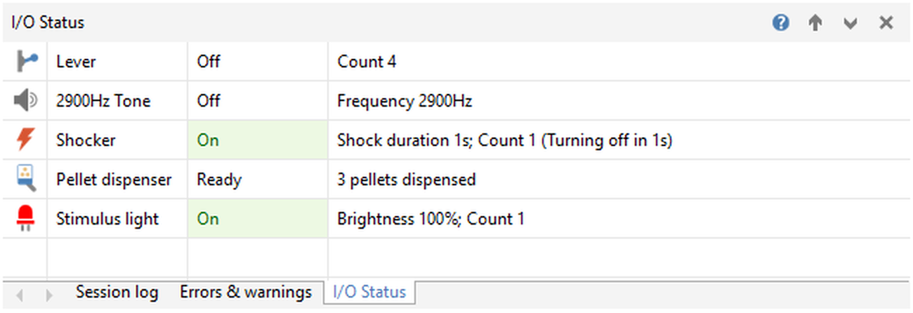 ANY-maze Help > The ANY-maze reference > The Tests page > The Test window > The I/O Status panel